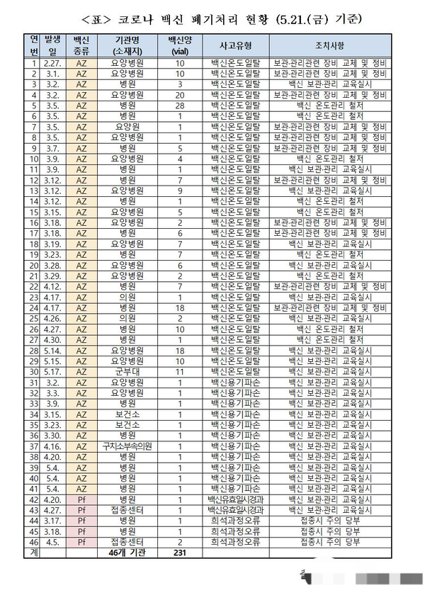 총 231바이알(2286도즈)이 관리 부주의 등으로 폐기됨