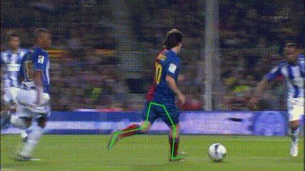 메시의 드리블에는 여러가지 장치가 있다. 위에서 보이는 것처럼 상대가 멈춰서서 자신을 기다릴 때에는 선페이크 후 상대가 움직이는 반대 방향으로 파고든다.